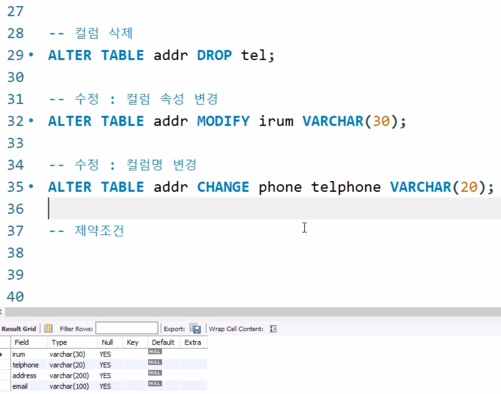 테이블 수정(ADD, DROP, MODIFY, CHANGE)