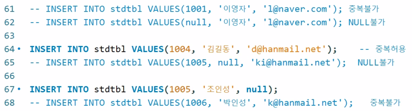 - 데이터 중복 불가, NULL값 불가