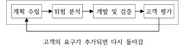 - 고객의 요구사항 변화에 유연하게 대응할 수 있도록 일정한 주기를 반복하면서 개발하는 모형