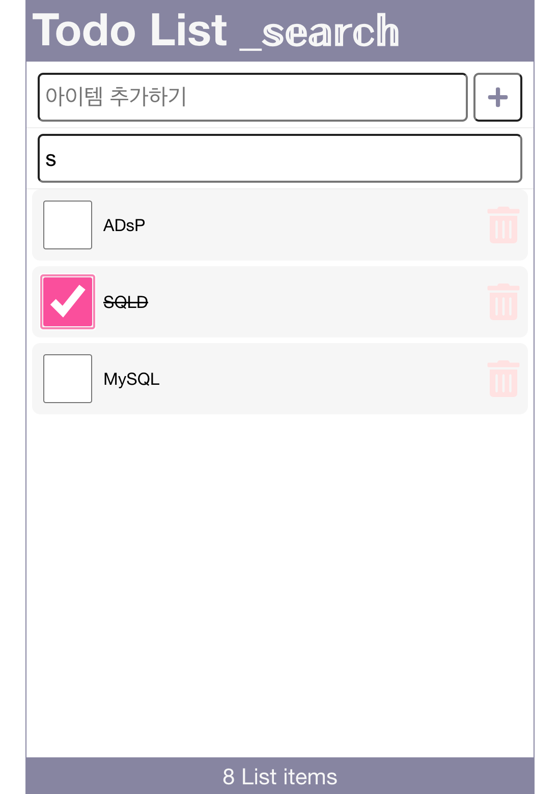 | [React/리액트] 검색기능을 추가한 Todo List 만들기 - 컴포넌트 모음 | ItemList, AddItem, LineItem (0) | 2023.08.21 |