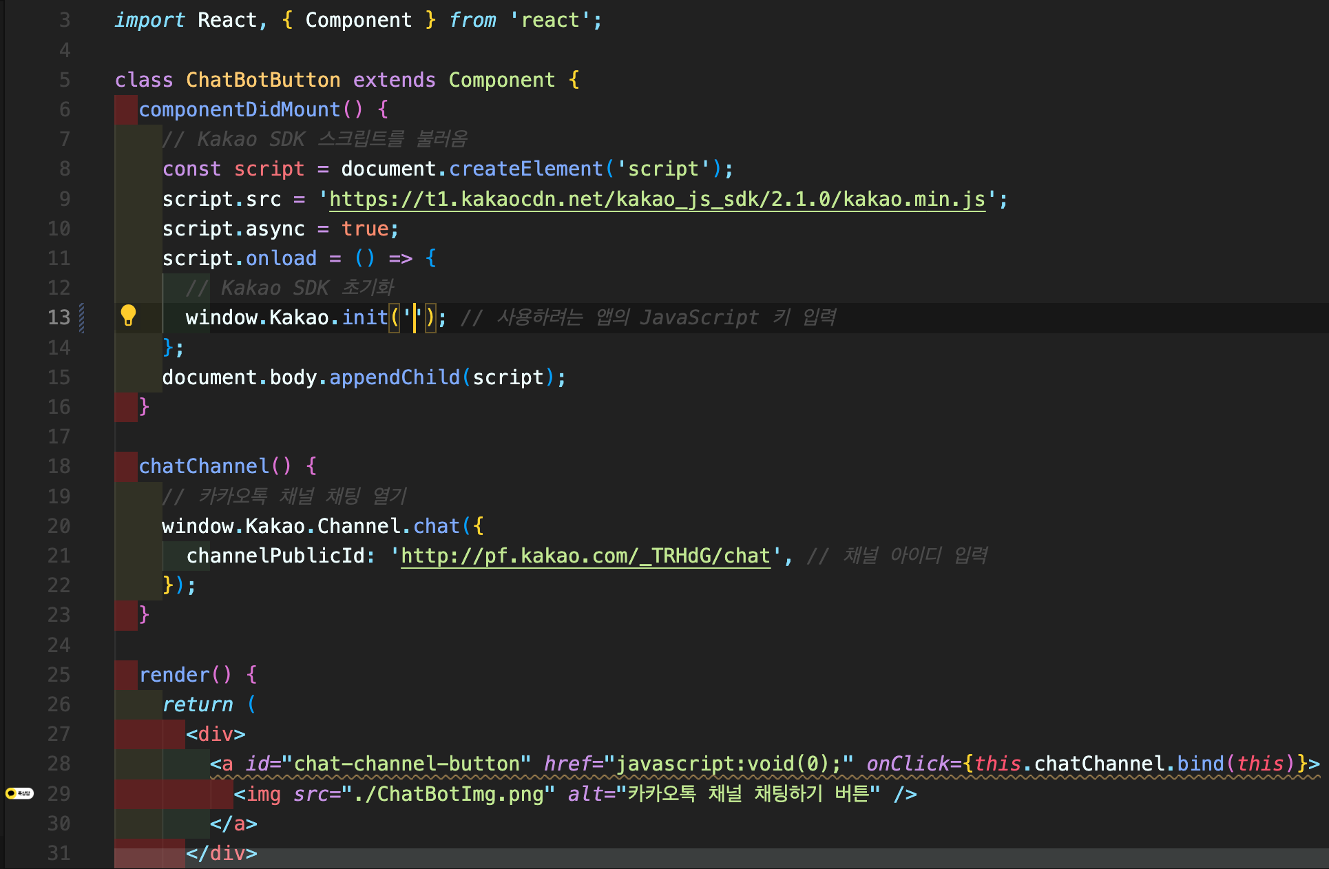 그래서! 카카오API로 우하단에 카카오채널로 바로갈 수 있는 버튼을 생성하려고 했는데!