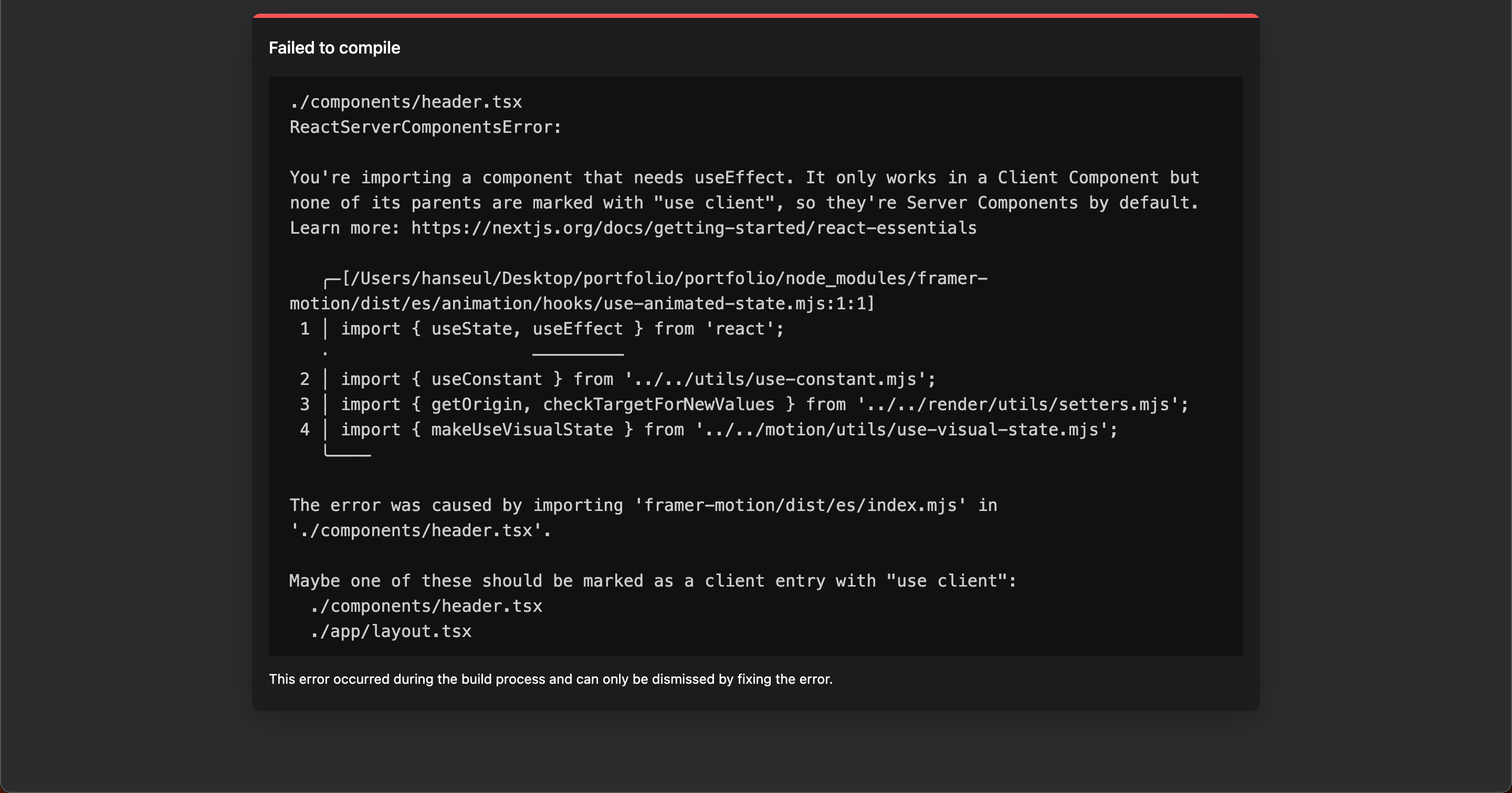 The error was caused by importing 'framer-motion/dist/es/index.mjs' in './components/header.tsx'.