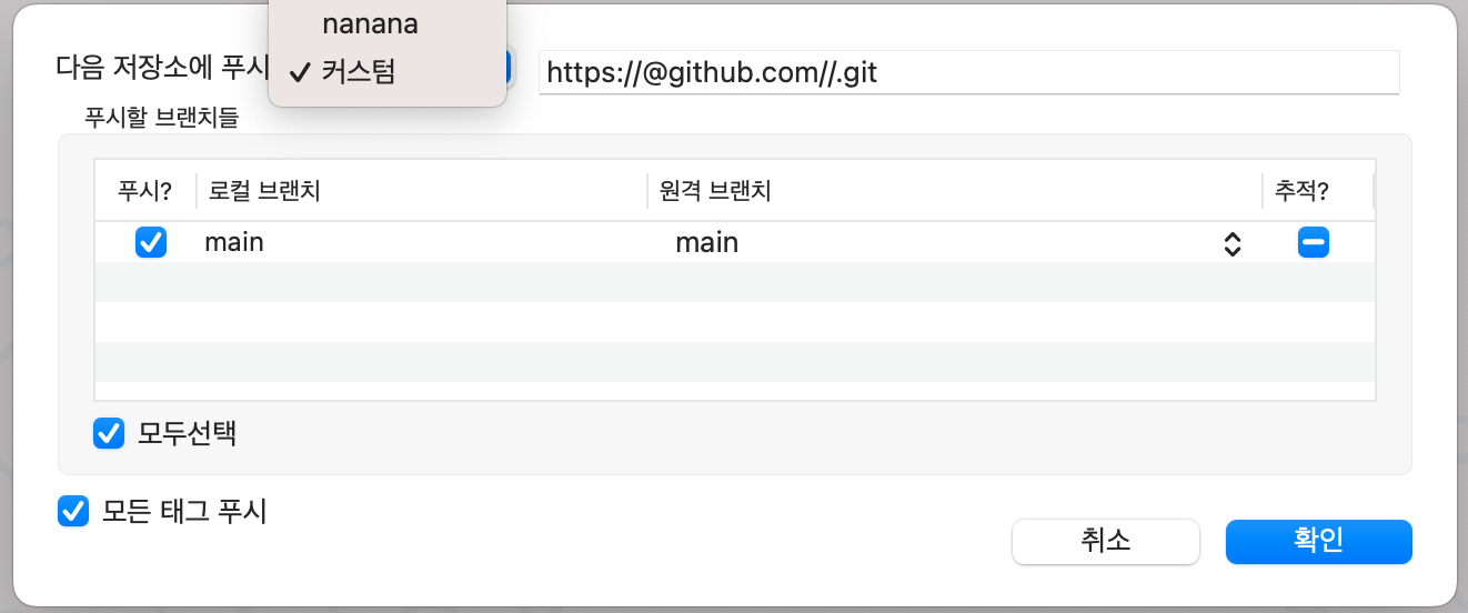 4. 위에 푸쉬버튼을 누르면 이 창이 뜨는데 저렇게 눌러서 저장소를 선택한다. (오른쪽에 주소는 저장된게 자동으로 뜸)